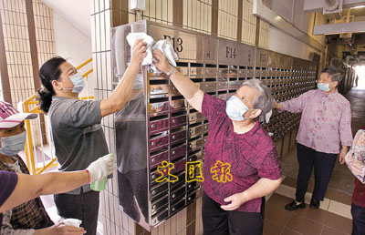 ■數十名上水彩園h居民,昨在屋h範圍內進行「上水區抗疫清潔大行動」。 本報記者劉國權 攝
