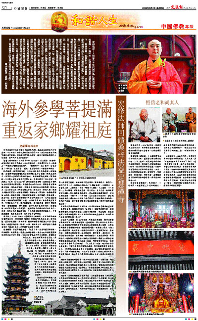 宏修法師:上世紀九十年代初作為江蘇法師參學到香港,十餘年來,追隨香港愛國高僧紹根長老座下,勤學苦修,弘法利生,愛國愛教。多年來熱心參與祖國在海外的各類宗教活動,「佛指舍利蒞港」、「千佛耀濠江」等都能看到他繁忙的身影,特別是他所在的香港佛學會,現已在祖國內地捐資修建希望小學150餘所。身為理事副會長的宏修法師十餘年來致力於香港、內地之間的佛教文化交流,碩果纍纍。2008年,宏修法師應江蘇如皋定慧禪寺方丈、其恩師恆岳老和尚的召喚,出任定慧禪寺住持,為回饋桑梓養育之恩,宏修法師放棄了自己在香港一切,攜巨資1200餘萬人民幣恢復建設定慧禪寺、擴大慈善場所。宏修法師此舉在香港引起巨大轟動,作為資本商品化的香港,廟產皆屬於僧人私有財產,宏修法師投資全民所有定慧禪寺的舉動,不容置疑,是無私的。據悉,宏修法師是繼台灣佛光山星雲大師回家鄉江蘇捐資興教的第二個海外歸來投巨資的法師。記者了解,海外宗教人士回祖國恢復興建宗教場所、慈善設施的善舉,近幾年來全國各地越來越多。眾緣和合,充分體現了國家改革開放以來宗教政策的向心力和感染力。早春三月,太湖之濱無錫舉辦了令全球矚目的第二屆世界佛教論壇,會議閒暇,記者驅車至如皋定慧禪寺,親身領略了這座聞名於世的千年古剎。