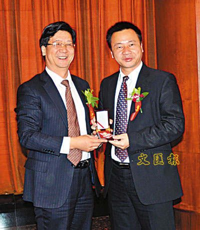 ■吳長江3月9日參加本報贈報儀式並接受本報董事長兼社長王樹成(左)致贈禮物。