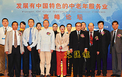 2009年1月7日中國慈愛園舉辦「發展有中國特色的中老年服務業高峰論壇」。中宣部原副部長龔心瀚(右五)、上海市人民政府決策諮詢專家花建(右三)、上海市老年學學會秘書長孫鵬鏢(右一)、台灣安養協會原秘書長龔林慶(左二)、廣東省文化產業研究中心常務副主任單世聯(右二)、中國慈愛園執行主任蔣覺成(左六)等出席並分別作主題發言。