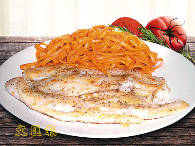 ■魚柳洗淨,抹乾水,以鹽、黑椒粉及巴瑪臣芝士粉調味,用少許橄欖油煎至兩面金黃,上碟備用;