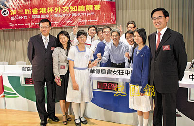 【本報訊】(記者 歐陽杏櫻)「第三屆香港杯外交知識競賽」準決賽昨經過4場激烈賽事,終誕生出5隊精英強隊晉身總決賽,包括觀塘瑪利諾書院、浸信會呂明才中學、沙田培英中學、皇仁書院及過去2屆競賽盟主中華傳道會安柱中學。當中安柱中學更取得726分出線,為20隊參賽隊伍中最高分的一隊。外交部駐港副特派員楊子剛昨大讚全體參賽者準備充足及比賽認真,又特別祝賀5強總決賽隊伍,及勉勵學生可透過比賽多了解祖國,多關心及支持祖國的外交事業。
