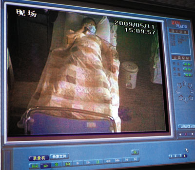 ■這是5月11日在成都市傳染病醫院甲型H1N1流感醫療救治指揮部大屏幕上拍攝到的內地首例甲流患者正用手機和外界聯繫。這名包姓中國留學生正在成都市傳染病醫院接受治療,目前病情穩定。 新華社