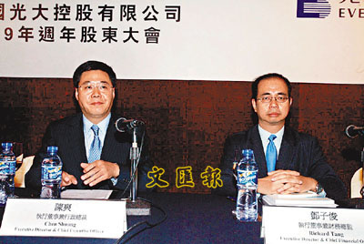 ■陳爽(左)表示,光銀從來沒有申請在香港H股上市。旁為執行董事兼財務總監鄧子俊(右)出席該公司股東周年大會。 本報記者張偉民 攝