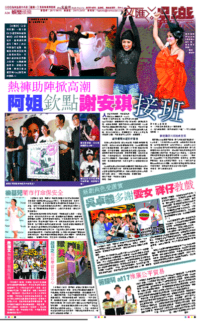 【本報訊】(記者 李思穎)一連七場《好多謝安琪吶喊演唱會》於前晚圓滿結束,當晚請來剛陞任「羅太」的汪明荃擔任嘉賓,新婚後的阿姐首度踏上香港的舞台,年屆61歲的她依然魅力四射,以熱褲風騷現身,掀起全晚高潮,阿姐又揚言謝安琪(Kay)將是她的接班人!