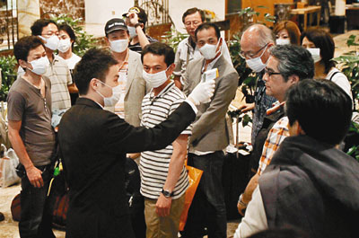 ■廣東省疑似病例的男患者曾入住旺角帝京酒店,酒店職員忙於為旅客量度體溫。 本報記者曾慶威 攝