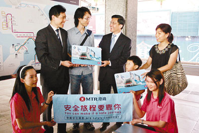 ■為提高乘客的安全意識,港鐵公司副車務總監李殷泰(後排左三)表示,港鐵將舉行為期一個月的「安全運動」,委派約百名中學生擔任「神秘安全大使」,向「模範乘客」大送1,500張單程車票作獎勵。本報記者 莫雪芝 攝