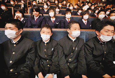 ■日本初中學生全部戴著口罩嚴防甲型H1N1流感。日本目前已確診191名甲流患者,4,000間學校停課。 美聯社