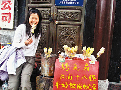 大理名產是烤乳扇、乳餅及蜜餞,對喜歡芝士的我來說,烤乳扇是一種很有特色的甜點,對比五至十元人民幣就可以吃到飽的雞涼粉或涼麵,烤乳扇價錢是高了些。雲南和四川一樣,很多美食都非常辛辣,對不能吃辣的我,總是吃得汗流滿面,但仍樂在其中。