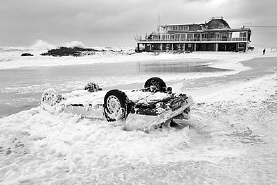 澳洲昆士蘭省連日來遭暴風雨吹襲,引發35年來最嚴重水災,多達7.5萬戶房屋斷電,近250間學校停課。在著名度假景點黃金海岸,一名46歲男子被強風吹倒的大型鐵片擊斃。圖為被吹翻的車。 法新社