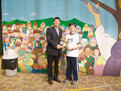 ■利嘉閣精英會會長趙保杰(左)將籌集得來的獎盃贈予將軍澳基德小學,並由該校代表朱老師(右)接受。