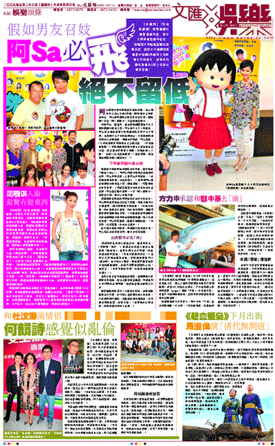 前晚阿Sa、錢嘉樂、曾志偉等到觀塘為小丸子電影版進行配音工作,阿Sa為小丸子一角配音。阿Sa笑言過往曾被父母用飯碗蓋著剪小丸子髮型,自覺跟小丸子的性格很相似,大家都是練精學懶的人及很勇敢。問她如何勇敢?阿Sa笑道:「以前拍拖很多時都是自己主動示愛。(可試過被拒絕?)多數都是覺得對方對自己有意思至會示愛,表白後最多是被人拒絕,好過放係心入面。(最近一次示愛是幾時?)讀書時期,因為現在很難找到一個祖漱H。」