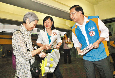 ■鍾嘉敏與譚耀宗一起到鵝頸區為補選派發傳單。本報記者潘政祁 攝
