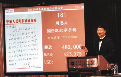 逾4小時的拍賣不乏高價成交品,除了張孝友的《上林春汛圖》以逾300萬元成功賣出外,潘鴻海的《少女與青花瓷》、元影青釉裡紅壺以80萬元高價成交,謝稚柳的《水月觀音像》亦以75萬元成交。眾成功拍賣的精品中,最矚目的是已故國務院總理周恩來1962年9月11日的一張國務院批示手稿,這紙信箋一推出即獲承價,最終以48萬元高價成交。