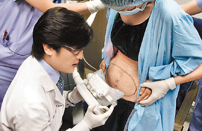 ■陳衍里使用最近研發的冷凍溶脂技術,消除黃小姐多年來的腹部脂肪。本報記者羅敬文 攝
