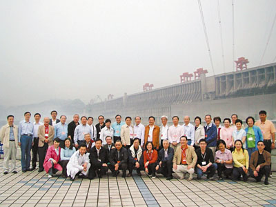 ■考察團全體成員在三峽大壩前合影。 本報記者鄭銳 攝