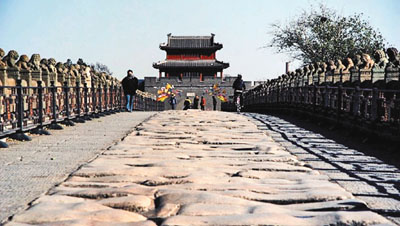 盧溝橋—中國北方最長的聯拱石橋(橋全長266.5米,寬9.3米),源於金代燕京八景之一的「盧溝曉月」,名氣可與長安八景之一的「灞橋風雪」相呼應;《盧溝運筏圖》與《清明上河圖》並稱為一宋一元兩幅古畫堪稱姊妹名卷,在歷史價值上各擅其長和藝術價值上可互相媲美;盧溝橋石欄為長列的歷史畫卷,望柱柱頭刻有仰伏的蓮座,座下刻有荷葉墩,柱頂雕有高踞的石獅。整個雕塑形態精巧、生動有趣,堪稱我國橋樑雕塑藝術的傑作,具有一脈相承的民族藝術藝韻。天下名橋各擅勝長,而盧溝橋卻以高超的建橋技術和精美的石獅雕刻獨具風韻,譽滿中外,實屬古今中外一大奇觀。意大利旅行家馬可.波羅在他的遊記中稱讚「它是世界上最好的、獨一無二的橋」。