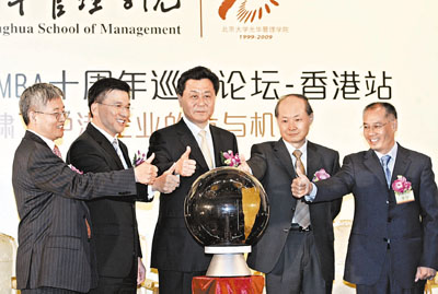 【本報訊】(記者 沈清麗)「北京大學光華管理學院EMBA十周年巡迴論壇—香港站」,於本月23日下午在港島香格里拉大酒店舉行。因應當前金融危機,光華管理學院以「金融海嘯下中港企業的危與機」作為是次論壇主題。北大光華管理學院院長張維迎、香港特區財經事務及庫務局局長陳家強、光華管理學院EMBA香港校友會會長李寧、中銀國際控股有限公司首席執行官王岩、與瑞銀投資銀行亞太區主席蔡洪平就此主題進行對話。