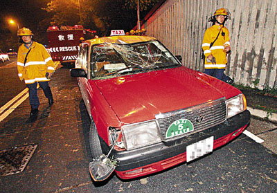 【本報訊】將軍澳昨晚深夜11時發生3日來第4宗塌樹壓毀汽車事故。一部的士接載一家三口乘客沿寶琳北路往將軍澳,途至康盛花園附近,路邊一株大樹疑經不起強風吹襲,有兩條分別3米及2米長的大樹丫倒塌,不偏不倚,命中經過的士車頭,的士擋風玻璃應聲粉碎。警方接報與消防員大為緊張趕到現場,證實無人被困。