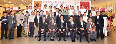 ■「俊彩金聲二十春-香港福建書畫研究會成立20周年會員作品展」揭幕,主禮嘉賓與該會成員合影。 本報記者曾慶威 攝