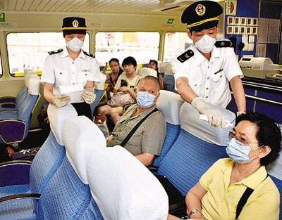■深圳蛇口口岸的檢疫人員在一艘由澳門駛入的客輪上對旅客進行體溫檢查。新華社