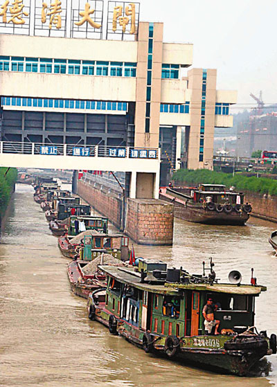30日,浙湖州拖036號拖隊的10多艘貨船有序通過德清大閘。德清大閘位於浙江省德清縣乾元鎮。目前,每天過往德清大閘的運輸貨船有近千艘,比去年同期上升20%左右。 新華社