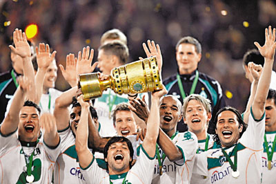 【綜合外電】德國盃決賽,雲達不來梅1:0擊敗利華古遜,第6次奪標(見圖)。中場奧斯爾在換邊後13分鐘,在禁區內起腳破網。另外,法甲在30日進行了最後一輪比賽,已經豪取聯賽10連勝的波爾多作客一球小勝卡昂,時隔10年之後再次捧得聯賽冠軍。