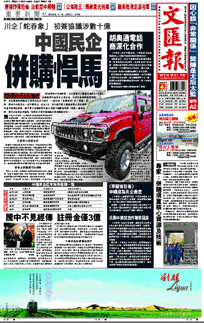 【本報駐四川記者向雷、北京新聞中心實習記者何凡3日電】美國通用汽車百年王朝終結,全球汽車業面臨重新洗牌,在各國車廠搶購瓜分通用家產的大潮中,一度代表「美國精神」的「悍馬」品牌,極有可能將易主一家中國民企。截至3日,四川騰中重工機械有限公司及通用汽車方面都已證實,騰中重工收購通用汽車公司旗下越野車品牌「悍馬」確有其事,雙方已達成初步協議,但最終交易的協議條款尚待磋商決定。