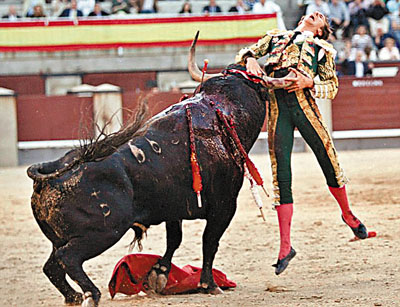 俗語有云行船跑馬三分險,但其實人類與蠻牛對壘亦是驚險萬分,好像最近在西班牙首都馬德里舉行的一場鬥牛賽事,就幾乎弄出人命。