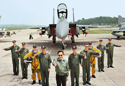 ■韓國總統李明博(中) 視察空軍基地。 美聯社