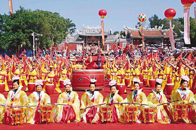 第十八屆海峽兩岸關帝文化旅遊節暨閩台水產品博覽會,日前在福建東山開幕。悅耳的「和平曲」、美妙的「和平舞」,在關帝祭祀大典上為海峽兩岸關帝文化旅遊節揭幕助興。 中新社