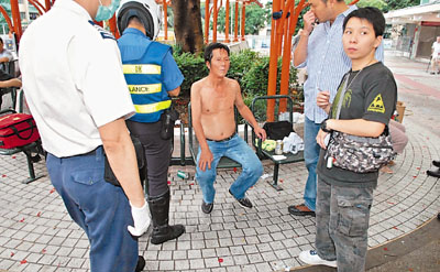 【本報訊】一名中年漢(見圖),昨下午在何文田愛民h一休憩公園酒後與另一男子發生爭執,期後遭人以灼熱的液體照淋頭,疑兇逃去,一度惹起淋鏹水驚魂,救護員到場相信並非腐蝕性液體,替傷者沖洗後送院。