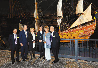■曾俊華出席香港/歐盟及歐盟/香港經濟合作委員會的10周年全體會議歡迎晚宴,並在現場展出的一艘17世紀復修的瑞典戰艦瓦薩號前合照。