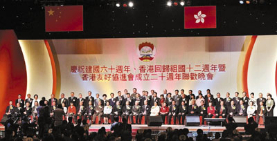 ■香港友好協進會舉行慶祝建國60周年、回歸12周年和創會20周年聯歡晚會,賓主合照。 本報記者曾慶威 攝