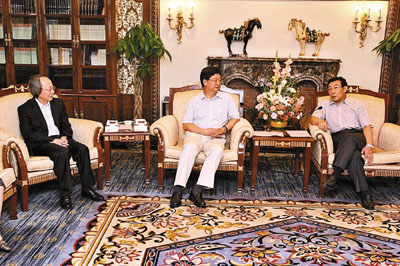 ■福建省委常委、宣傳部部長唐國忠(右)在福州會見本報社長王樹成(中)、總編輯王伯遙一行。 黃嵩 攝