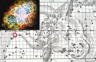 ¡@The first listed Messier object (M1 or better known as the Crab Nebula) is a supernova remnant. When a massive star burns up its fuel, it ends its life in an explosion. Such a rare event was actually observed by the Chinese in 1054. According to literature, a ¡§guest star¡¨ was seen near¡§Tian-guan¡¨(the southern horn of Tarus, the bull). The star could be seen for 653 days. It could even be seen in broad daylight, just like Venus, for 23 days. 677 years later, John Bevis (British amateur astronomer) swept up its dim remnant and put it in his¡§Uranographia Britannica¡¨. Bevis discovered the Crab 27 years before Messier did. In 1968 astronomers identified the star core that was left behind after the supernova explosion.¡@¡½ºÂªK±j¡@¸ê²`¤Ñ¤å·R¦nªÌ¡@Ãɪ¬¬P¶³¹Ï¤ù¨Ó·½¡GNASA/ESA