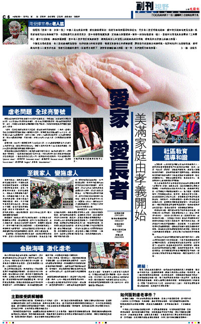 俗語說「家有一老,如有一寶」,中國人自古推崇孝義,對長輩尊重有加,但近年虐老問題卻時有發生,許多老人家受照顧者施虐,當中很多施虐者更是至親。雖然香港近年出生率急劇下跌,但家庭衝突反而愈來愈多,家中老弱會首當其衝,受到暴力問題威脅。星期一的視野版提到,個人、家庭和社會是息息相關的「三角關係」,當子女受經濟、感情問題困擾,家中老人家亦會受到負面影響,輕則是精神上和言語上的施虐或疏忽照顧,重則是涉及肢體上的暴力問題。