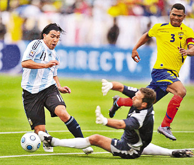 【綜合外電】昨晨南非世界盃外圍賽,阿根廷遭逢作客3連敗,繼上次慘敗給玻利維亞後再次命喪高原,吞厄瓜多爾雙蛋。泰維斯上半場博得12碼,但親自操刀「宴客」,換邊後更被艾奧維與柏拉斯奧斯兩記快腳妙射破門。阿足在第4位僅比第5的厄軍多2分(首4名出線、第5名打附加賽),餘下還要對巴西、烏拉圭與巴拉圭等勁旅,晉級形勢不容樂觀。