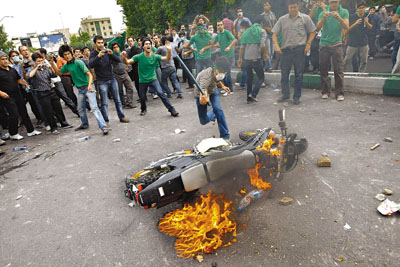 穆薩維(小圖)說不會屈服,更指宣稱內賈德勝選等於背叛選民,他的支持者響應上街,首都德黑蘭陷入10年來最嚴重的動盪場面。2,000人身穿綠衣在內政部大樓外高喊口號,焚燒車胎洩憤,與前來驅散的警察衝突,部分人向警員擲石,而一名便衣警員用棍打一名婦女。
