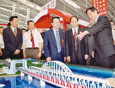 黑龍江省委書記吉炳軒(右二)、省長栗戰書(右一)視察哈洽會展館。