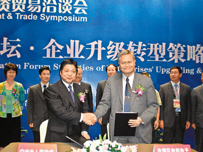 台灣電電公會副理事長鄭富雄日前在出席浙台合作論壇上表示,隨茖漵勻鰜Y的發展,大陸掀起「Buy China」及買國貨的潮流,在內地政府倡導的「家電下鄉」政策下,將使台灣的家電產業受益,而台灣電電公會將與寧波進行更進一步合作。圖為寧波市與台灣電電公會簽署合作協議。 本報駐浙江記者茅建興、白林淼傳真