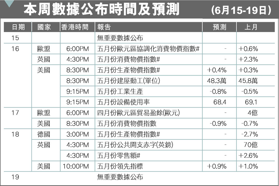 本周數據公布時間及預測(6月15-19日)