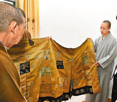 華嚴寺住持慧靜介紹,這件袈裟是朱明皇室萬曆年間所賜,而且是雲錦紫衣,面上用9條金線織成五爪金龍,目前全世界只發現此一件。