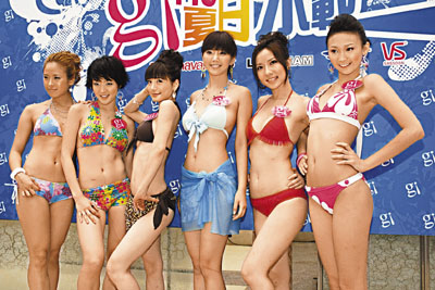 【本報訊】李曼筠(Maggie)、鍾蕙芝(Lavina)及周凱盈(Monique)與來自韓國的組合Yes,昨日到淺水灣出席《gi girls夏日水戰》活動,眾人均穿上三點式泳衣在泳池中大玩對抗賽,結果雖由韓國組合勝出,但論身材韓女則不及Maggie及Lavina。