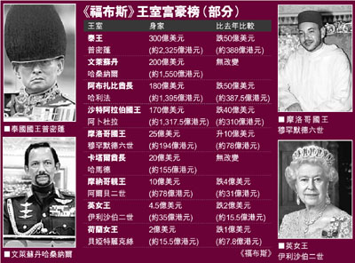 相比去年金融海嘯前,全球15個富有王室身家今年共縮水220億美元,下降17%,至1,090億美元(約8,448億港元),其中只有摩洛哥國王穆罕默德六世的身家有上升,他透過出售商品磷大賺一筆,另外文萊和卡塔爾兩個王室身家僥倖能保持不變。日本和西班牙等國王室的財富則不入前15名。 ■《福布斯》