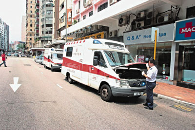 ■「老爺」救護車在窩打老道「拋錨」。 本報記者蔣焯文 攝