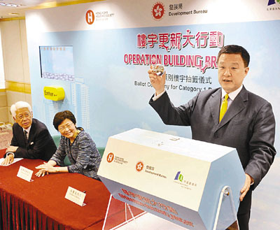 發展局局長林鄭月娥昨聯同房協主席楊家聲和市建局主席張震遠,主持「樓宇更新大行動」第一類別樓宇抽籤儀式,為約1,100幢樓宇釐訂發放津貼的優先次序,估計首批500幢樓宇的維修工程,最快可於今年第3季陸續展開。林鄭月娥表示,因財政司司長已預留額外10億元應付需求。 本報記者李志樑 攝