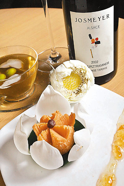 酒菜配近年大熱,在美酒映襯佳餚的同時,若能與中國的傳統文化聯繫,如這個《酒菜愛蓮說》,別具詩意。圖為柚子汁白蓮蓉酥配蓮花清茶。(a)