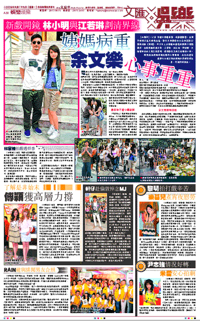 至於全程戴上墨鏡木無表情的余文樂,因為姨媽在醫院病重而心事重重,晚上即趕返港去探望姨媽,下星期再回來拍戲。他謂今次是友情客串,會拍兩、三個星期,同樣片酬亦是收「友情價」。問到家事可有影響他的心情?阿樂說:「盡量不會。」問到再跟過氣緋聞女友楊丞琳合作,覺得對方有何改變?他謂改變不大,依然後生。楊丞琳指他們一直無聯絡,問到阿樂今次可會問對方拿聯絡電話?他婉轉的說:「忘記問,我掛住拍戲,遲些工作上及宣傳都會見。」他又透露與楊丞琳有一場談情戲,問到會否怕再傳出緋聞時,阿樂無奈指無得避,如果大家的焦點放在他們身上,他都無辦法。