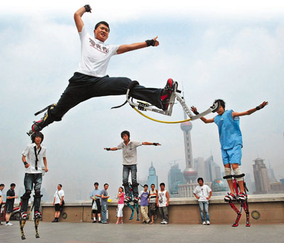■上海世博組委會向全球徵集街頭表演節目,讓身懷絕技的中外民間藝人登上世博大舞台。圖為上海年輕人在街頭表演「彈跳高蹺」。